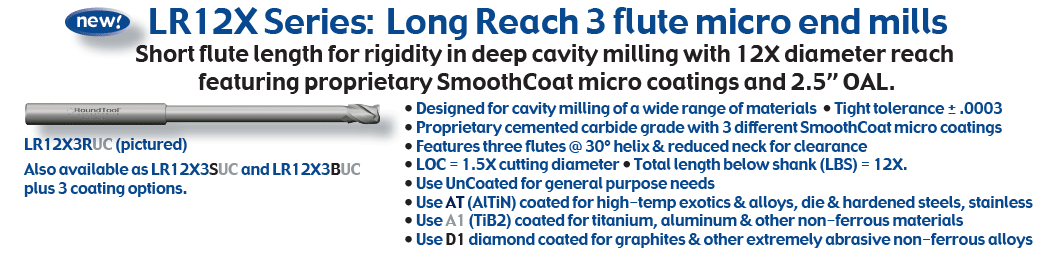 LR12X3RUC .1245 Ø .187 x 2-1/2 x 1/8 3 Flute .010 Radius 1.500 Lbs Long Reach Carbide Micro End Mill